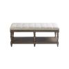 The Martha Stewart Highland Tufted Accent Bench with Shelf offers a sophisticated update to your home decor. This accent bench features a tufted upholstered seat that contrasts beautifully with the wood finish; for an elegant look. The turned wood legs elevate the design; while the solid wood veneer lower shelf provides plenty of storage space. Place this upholstered accent bench in your living room or bedroom to give your space added charm and style. Assembly is required and a tool is included.